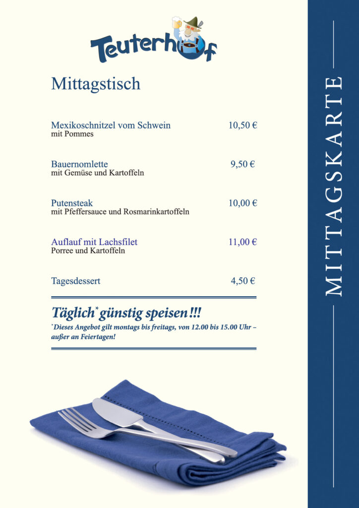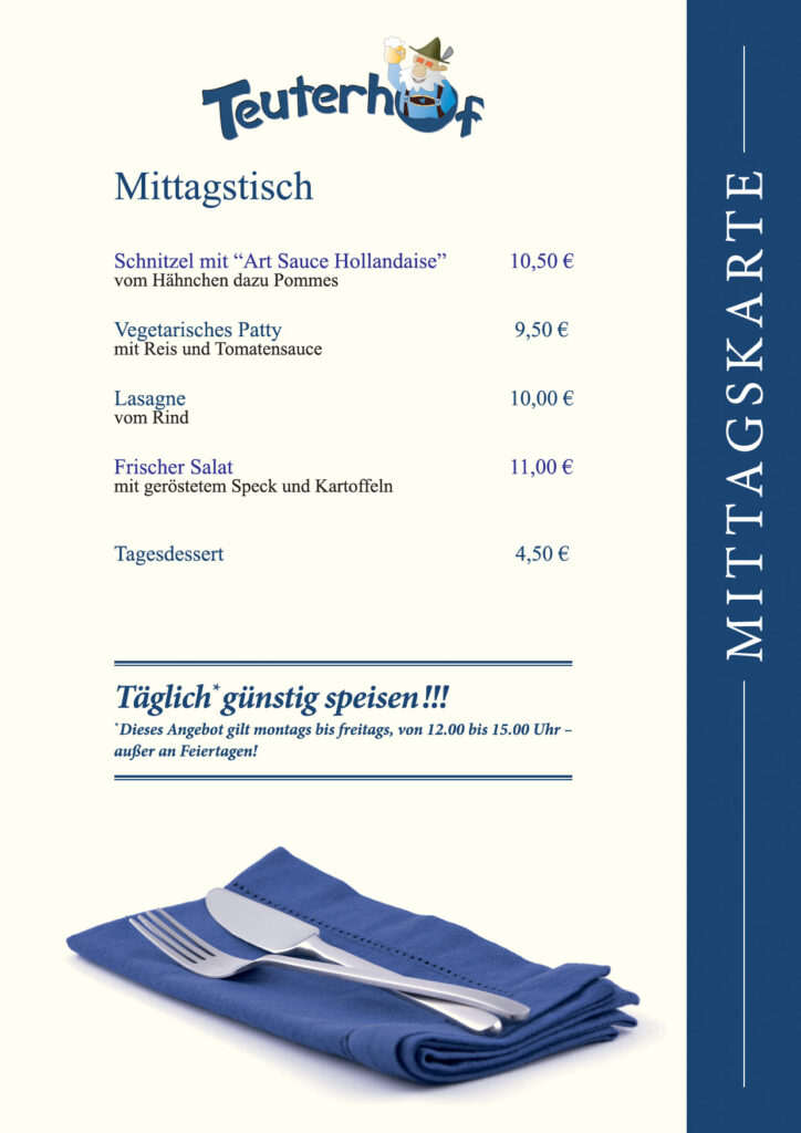 Unser Mittagstisch bietet euch von Montag bis Freitag (außer an Feiertagen) täglich wechselnde, frisch zubereitete Gerichte – von herzhaftem Pfefferschnitzel mit Pommes über cremigen Kartoffel-Porree-Auflauf bis hin zu feinem Seehechtfilet mit Spinat und Salzkartoffeln. Auch Vegetarier kommen auf ihre Kosten, zum Beispiel mit einem leckeren vegetarischen Burger oder einem frischen Salat. Genießt eine abwechslungsreiche Auswahl zu fairen Preisen – perfekt für eine genussvolle Mittagspause!